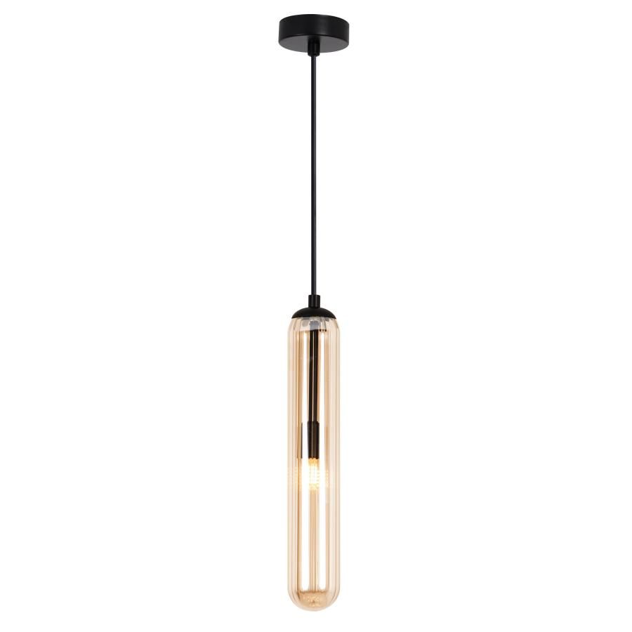 Minimalist amber glass cylinder pendant lamp with black metal base, bedside lighting for bedroom